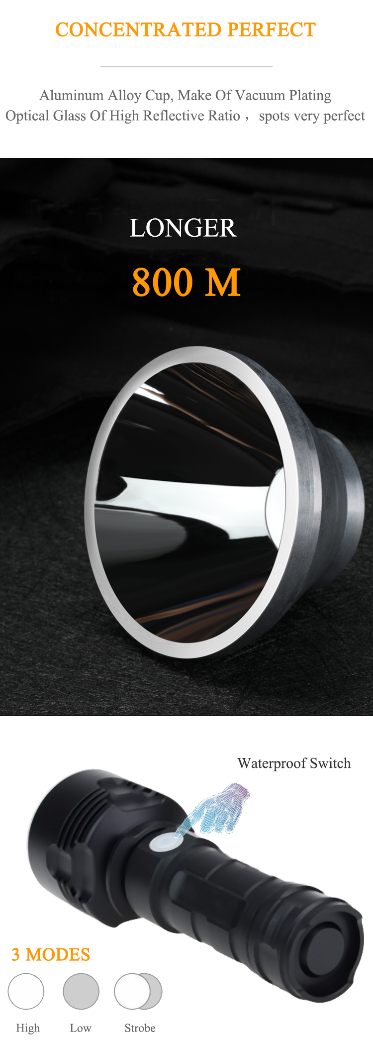 Light Source:LED LED Lifespan:100,000 hours Light Output:3 Mode Max Output:2500 lumen Max Range:800M Waterproof:IPX5 Material:Aluminum Alloy Battery Type:26650 / 18650 Li-ion Battery Color:Black Warranty(Year):1 OEM:Yes